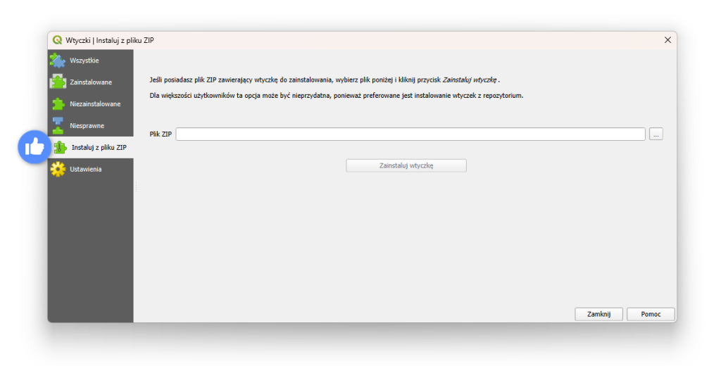 - W nowym oknie na zakładce „Instaluj z pliku ZIP” możesz wskazać pobrany plik. Następnie kliknij „Zainstaluj” – wtyczka zostanie dodana do aplikacji.